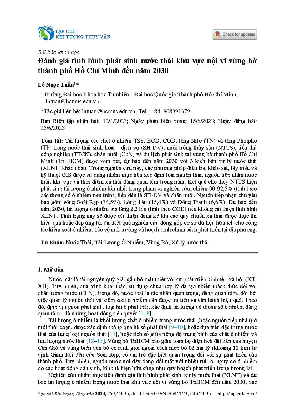 Đánh giá tình hình phát sinh nước thải khu vực nội vi vùng bờ thành phố Hồ Chí Minh đến năm 2030 = Assessment of wastewater generation in the inner area of the coastal zone of Ho Chi Minh City until 2030