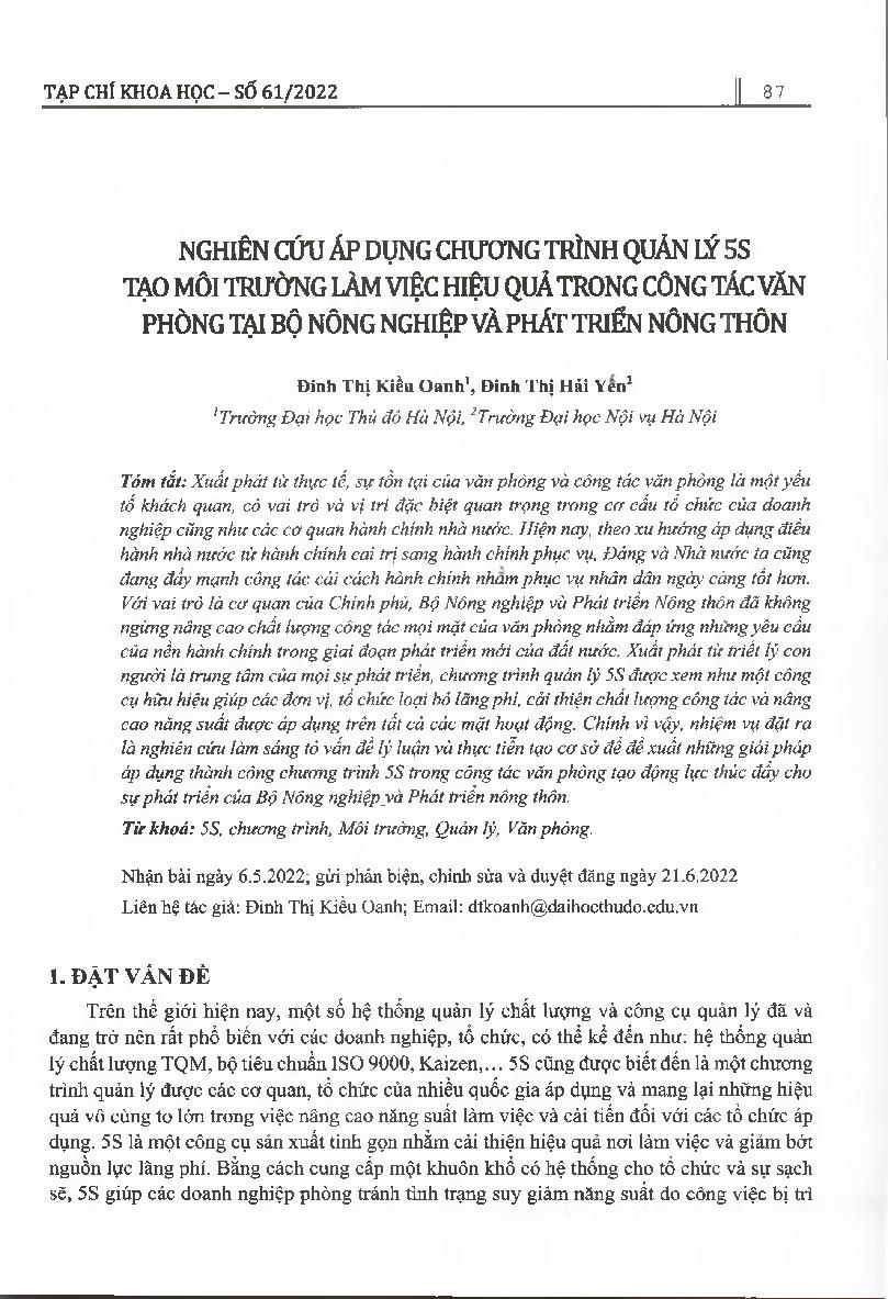 Nghiên cứu áp dụng chương trình quản lý 5S tạo môi trường làm việc hiệu quả trong công tác văn phòng tại Bộ Nông nghiệp và Phát triển Nông thôn = Apply 5s to create an efficient working environment for the office affairs in the Ministry of Agriculture and