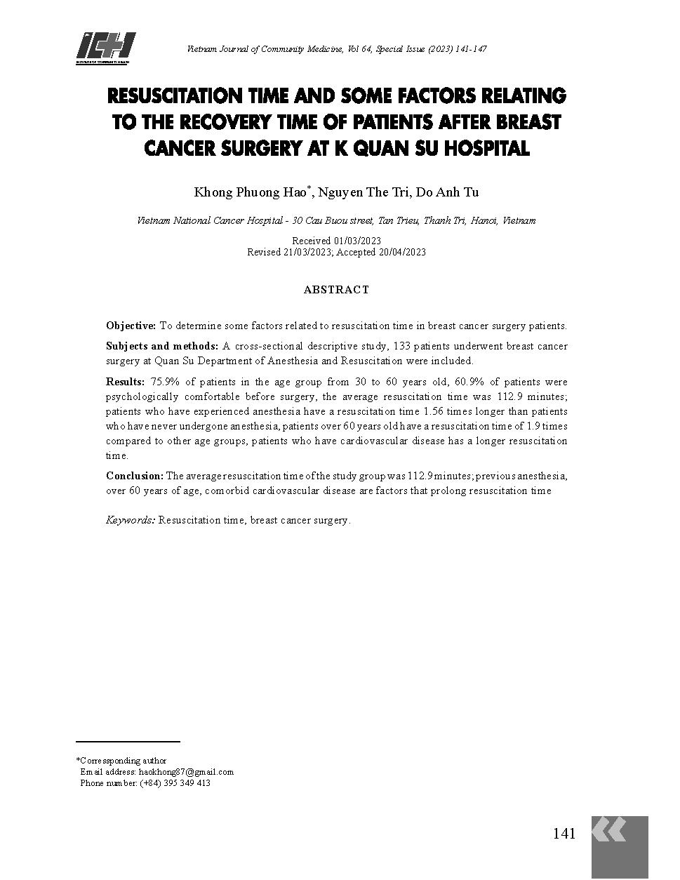 Thời gian hồi tỉnh và một số yếu tố liên quan đến thời gian hồi tỉnh người bệnh sau phẫu thuật ung thư vú tại Bệnh viện K cơ sở Quán Sứ = Resuscitation time and some factors relating to the recovery time of patients after breast cancer surgery at K Quan S