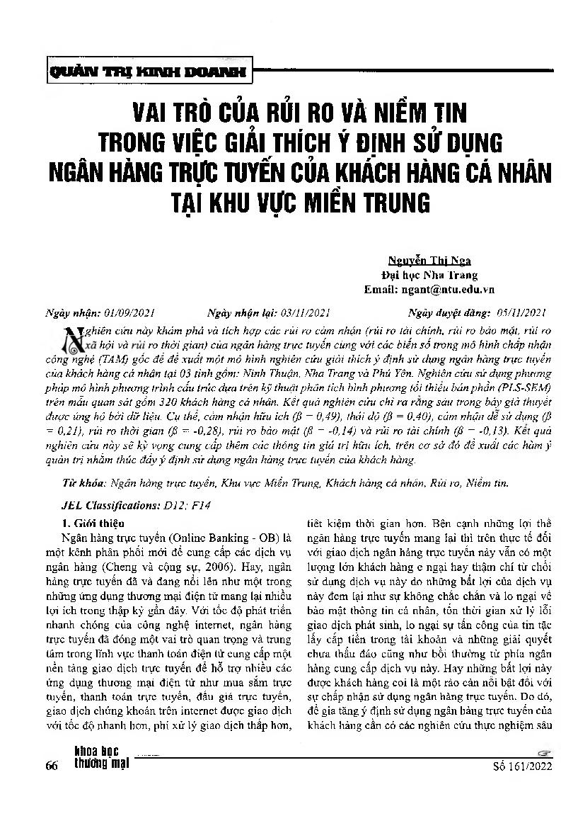 Vai trò của rủi ro và niềm tin trong việc giải thích ý định sử dụng ngân hàng trực tuyến của khách hàng cá nhân tại khu vực miền Trung = The Roles ofRisks And Trusts in Explain The Intention to Use Online Banking ofPersonal Customers in Central Region