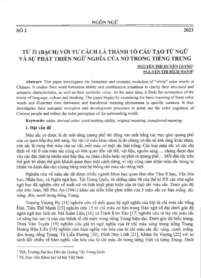 Từ 白 (bạch) với tư cách là thành tố cấu tạo từ ngữ và sự phát triển ngữ nghĩa của nó trong tiếng Trung = The character 白 (bạch) as a word formation component and its semantic development in Chinese