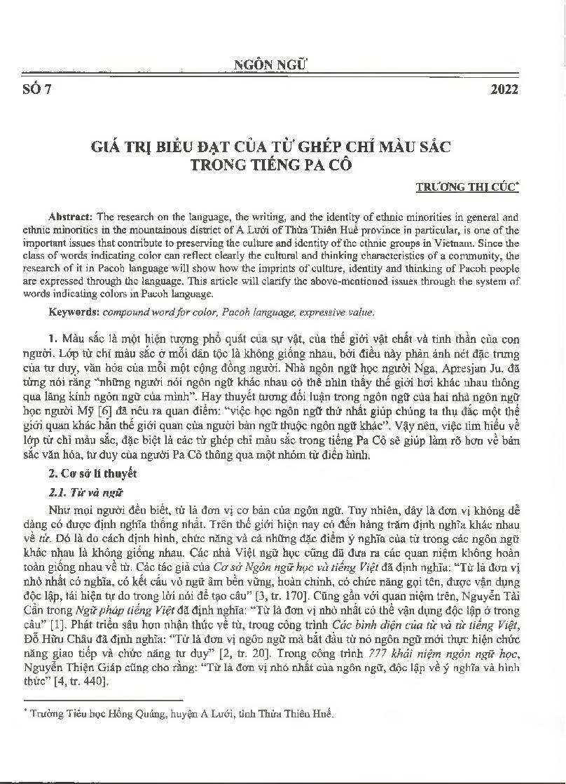 Giá trị biểu đạt của từ ghép chỉ màu sắc trong tiếng Pa Cô = Expressive values of compound words for color in Pacoh