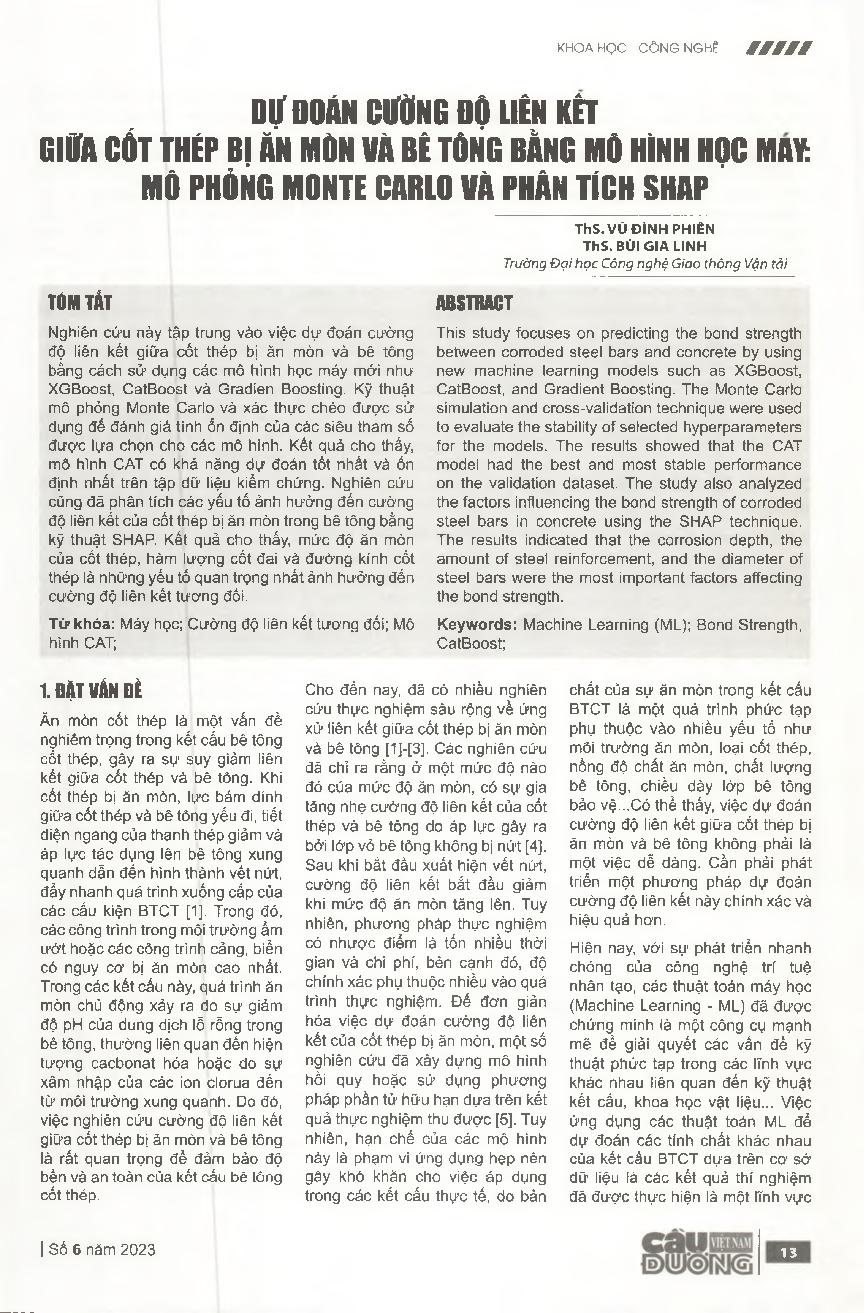 Dự đoán cường độ liên kết giữa cốt thép bị ăn mòn và bê tông bằng mô hình học máy: mô phỏng Monte Carlo và phân tích Shap
