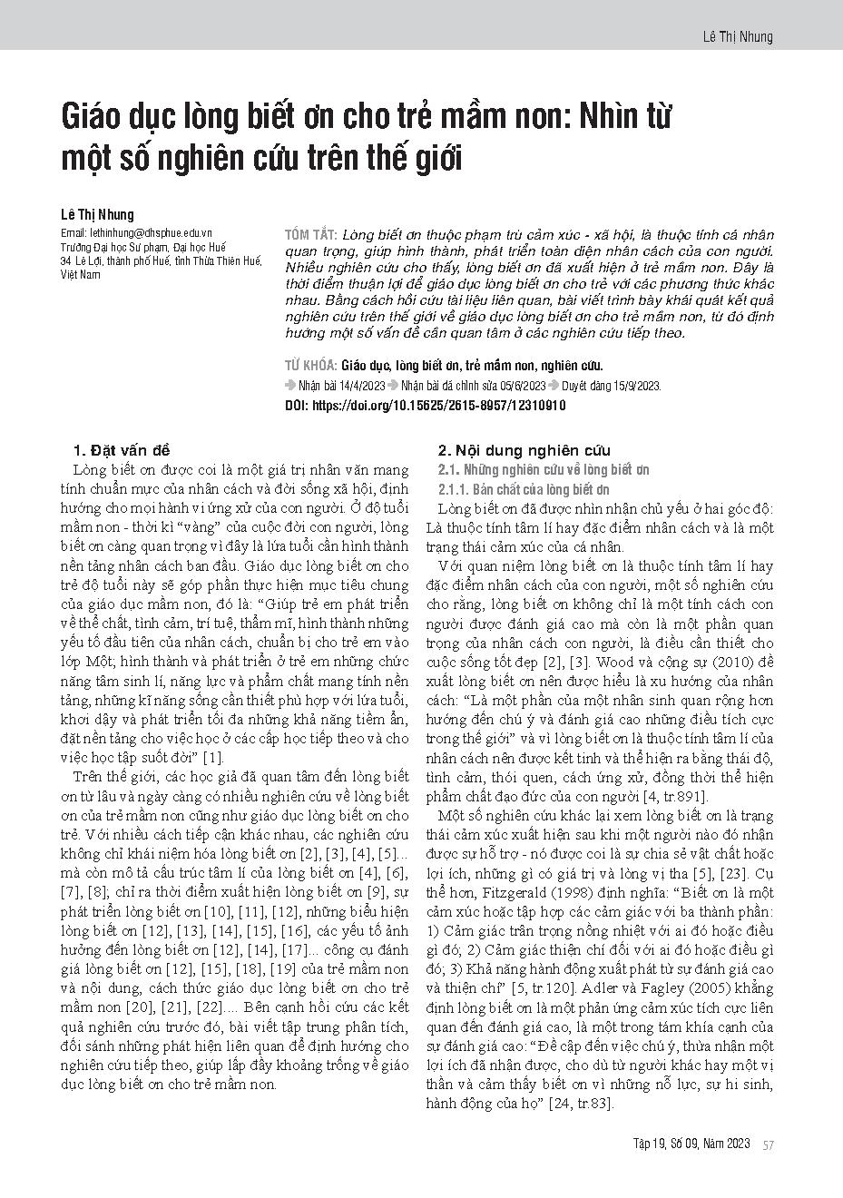 Giáo dục lòng biết ơn cho trẻ mầm non: Nhìn từ một số nghiên cứu trên thế giới = Gratitude education for preschool children: perspectives from some international reseach