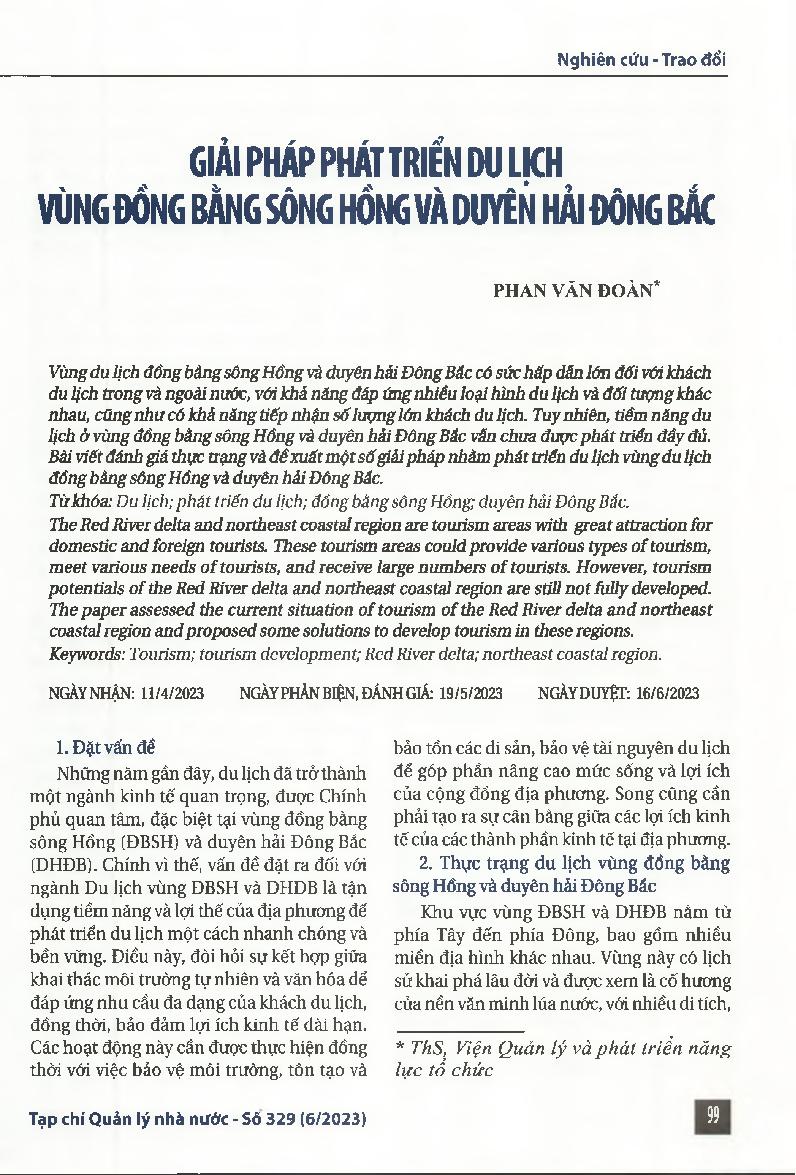 Giải pháp phát triển du lịch vùng đồng bằng sông Hồng và duyên hải Đông Bắc = Solutions for tourism development in the Red River Delta and Northeast Coast