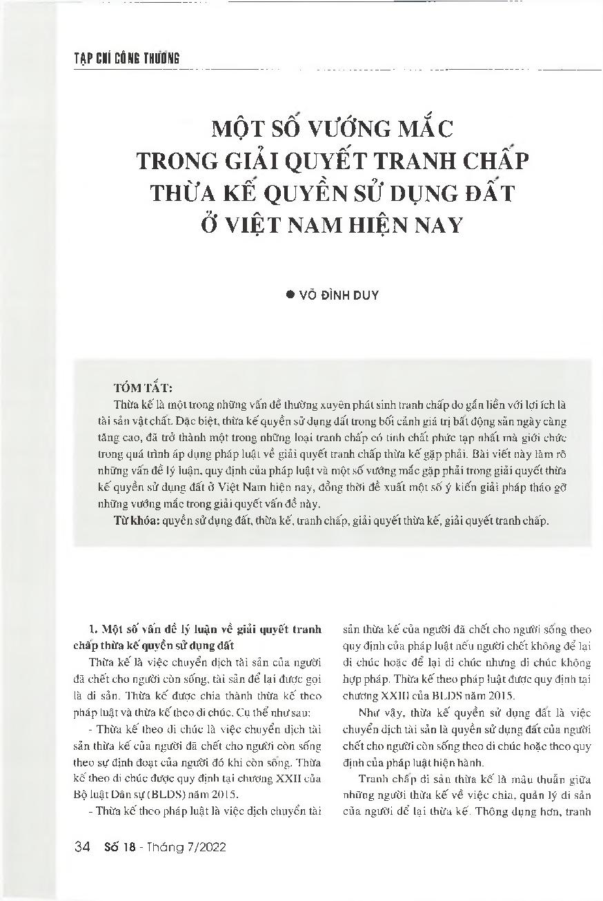 Một số vướng mắc trong giải quyết tranh chấp thừa kế quyền sử dụng đất ở Việt Nam hiện nay = Some problems in solving inheritance disputes about the land use rights in Vietnam