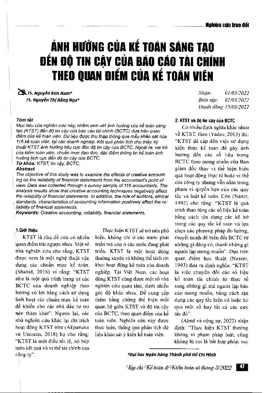 Ảnh hưởng của kế toán sáng tạo đến độ tin cậy của báo cáo tài chính theo quan điểm của kế toán viên = The effects of creative accounting on financial statements from accounters point of view