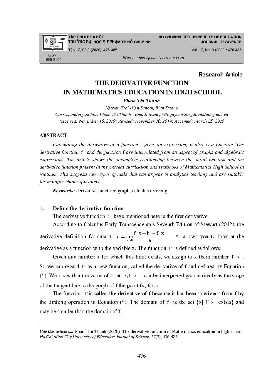 Hàm số đạo hàm trong dạy học toán bậc trung học phổ thông. = The derivative function in mathematics education in high school
