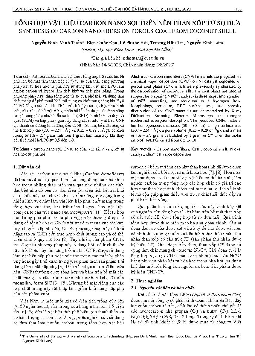 Tổng hợp vật liệu carbon nano sợi trên nền than xốp từ sọ dừa = Synthesis of carbon nanofibers on porous coal from coconut shell