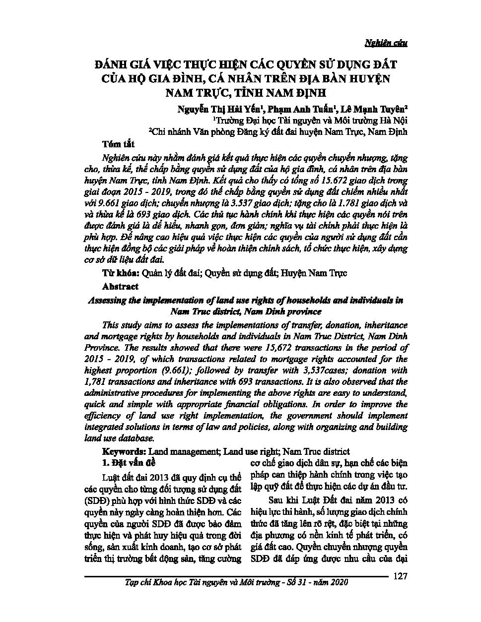 Assessing the implementation of land use rights of households and individuals in Nam Truc district, Nam Dinh province = 13. ĐÁNH GIÁ VIỆC THỰC HIỆN CÁC QUYỀN SỬ DỤNG ĐẤT CỦA HỘ GIA ĐÌNH, CÁ NHÂN TRÊN ĐỊA BÀN HUYỆN NAM TRỰC, TỈNH NAM ĐỊNH