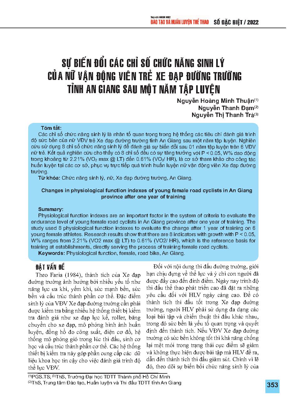 Sự biến đổi các chỉ số chức năng sinh lý của nữ vận động viên trẻ xe đạp đường trường tỉnh An Giang sau một năm tập luyện = Changes in physiological function indexes of young female road cyclists in An Giang province after one year of training