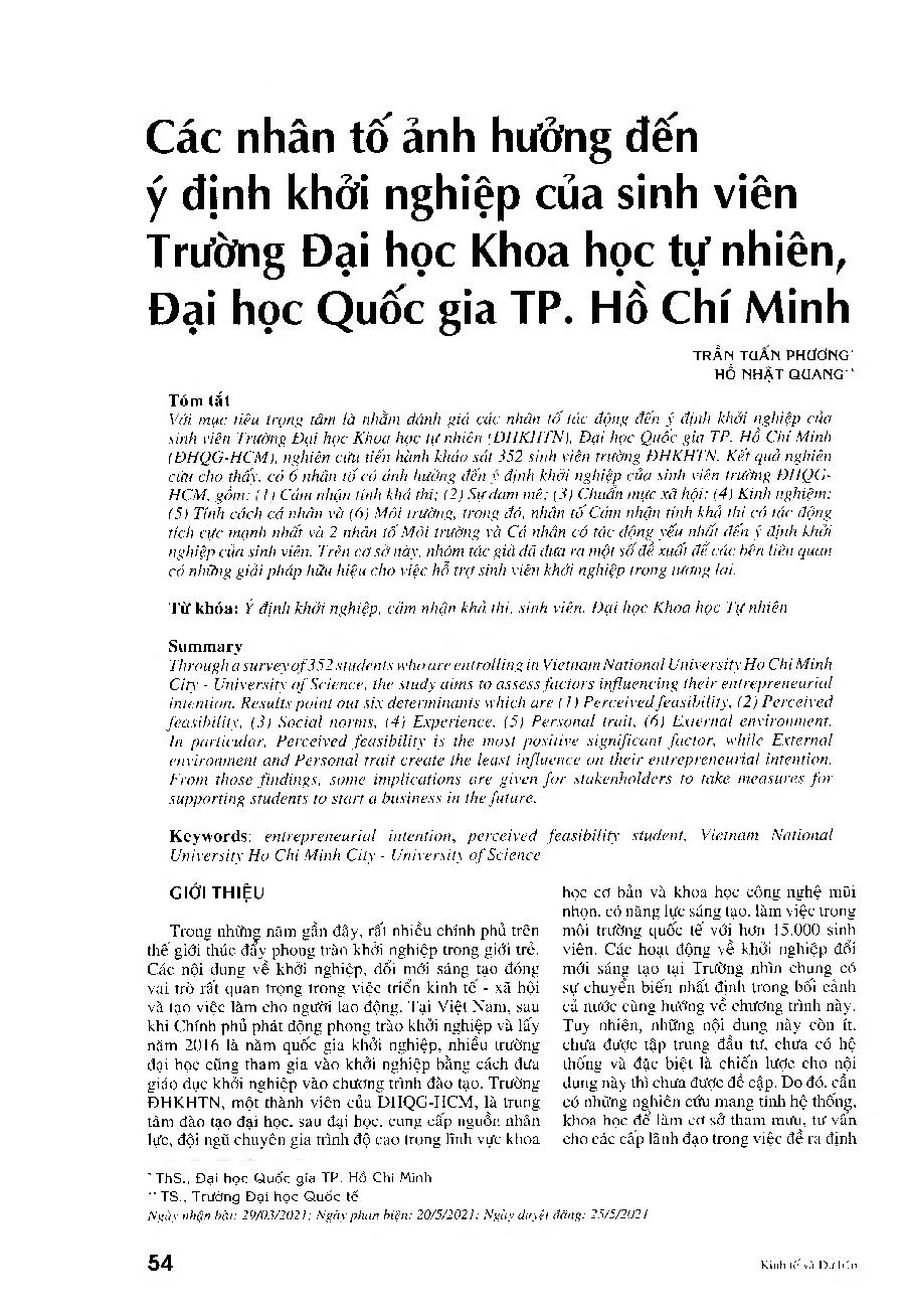 Các nhân tố ảnh hưởng đến ý định khởi nghiệp của sinh viên Trường Đại học Khoa học tự nhiên, Đại học Quốc gia Tp. Hồ Chí Minh