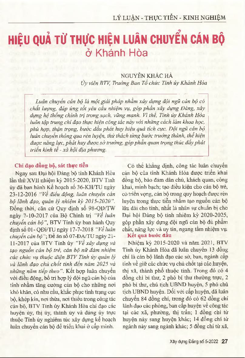 Hiệu quả từ thực hiện luân chuyển cán bộ ở Khánh Hòa = Effectiveness from implementing cadre rotation in Khanh Hoa
