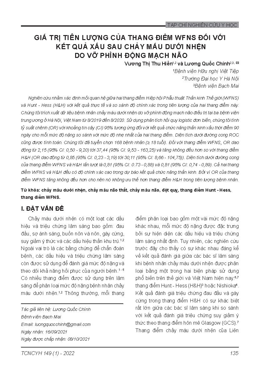 Giá trị tiên lượng của thang điểm WFNS đối với kết quả xấu sau chảy máu dưới nhện do vỡ phình động mạch não = Predictive validity of the world federation of neurosurgical societies (wfns) grading scale for the poor outcome after aneurysmal subarachnoid he
