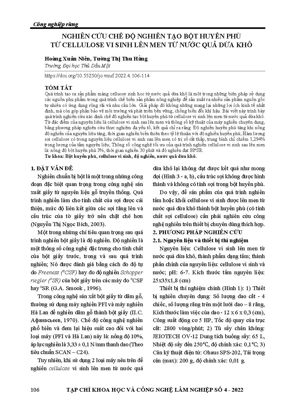 Nghiên cứu chế độ nghiền tạo bột huyền phù từ cellulose vi sinh lên men từ nước quả dừa khô = Research method of medication for pulping suspensions from microbial cellulose fermented from fruit juice