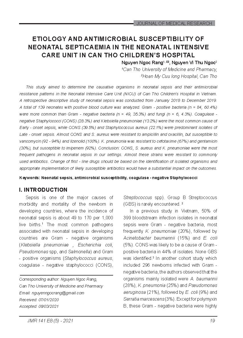 Căn nguyên và kháng sinh đồ của nhiễm khuẩn huyết ở trẻ sơ sinh tại Khoa Hồi sức cấp cứu sơ sinh, Bệnh viện Nhi Cần Thơ