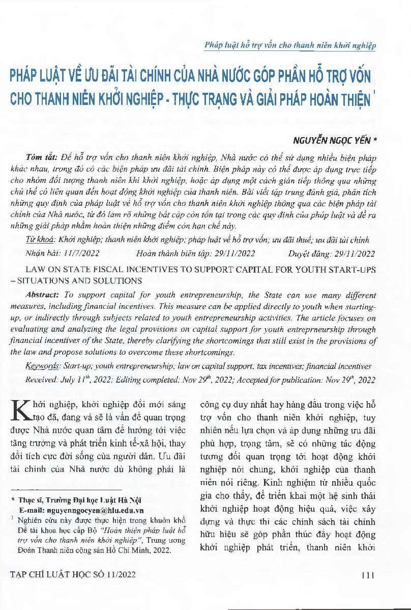 Pháp luật về ưu đãi tài chính của nhà nước góp phần hỗ trợ vốn cho thanh niên khởi nghiệp - Thực trạng và giải pháp hoàn thiện = Law on state fiscal incentives to support capital for youth start-ups - Situations and solutions