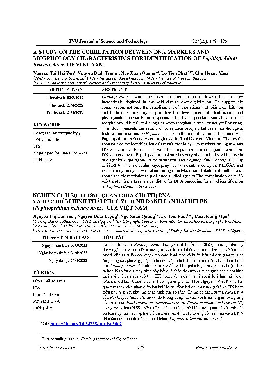 Nghiên cứu sự tương quan giữa chỉ thị DNA và đặc điểm hình thái phục vụ định danh lan hài helen (paphiopedilum helenae aver.) của Việt Nam = A study on the corretation between dna markers and morphology characteristics for identification of paphiopedilum