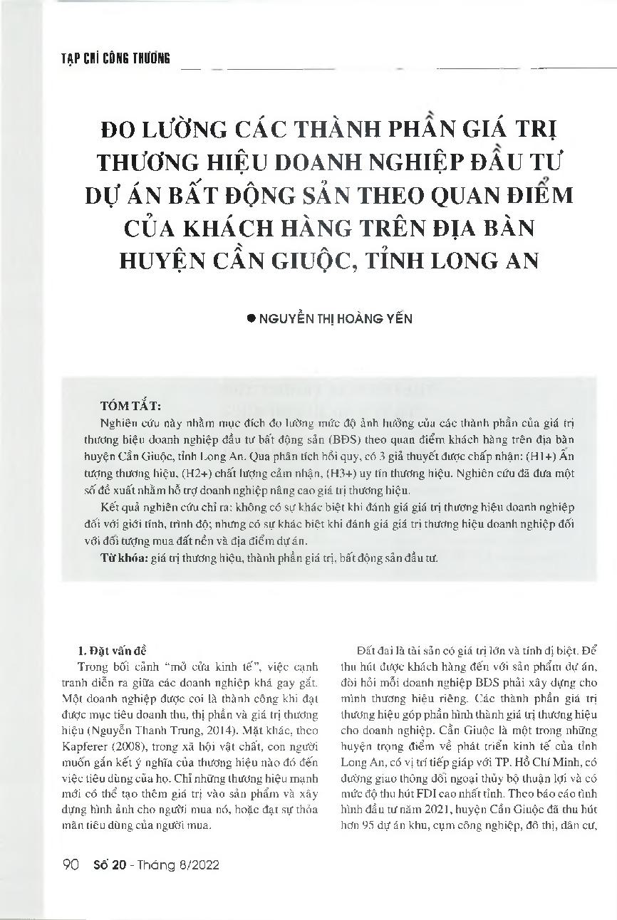 Đo lường các thành phần giá trị thương hiệu doanh nghiệp đầu tư dự án bất động sản theo quan điểm của khách hàng trên địa bàn huyện Cần Giuộc, tỉnh Long An = Assessing the impacts of each component of the brand value of real estate investment enterprises