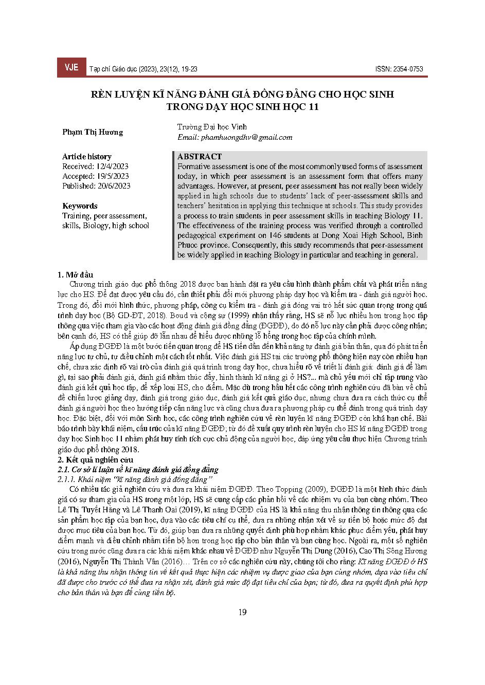 Rèn luyện kĩ năng đánh giá đồng đẳng cho học sinh trong dạy học Sinh học 11 = Training peer assessment skills for students in teaching Biology 11
