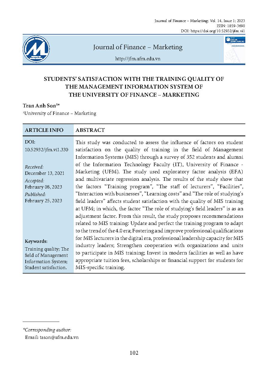 Sự hài lòng của sinh viên về chất lượng đào tạo ngành hệ thống thông tin quản lý của trường Đại học Tài Chính – Marketing = Students' satisfaction with the training quality of the management information system of the University of Finance – Marketing