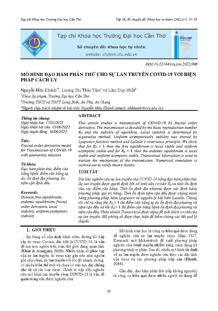 Mô hình đạo hàm phân thứ cho sự lan truyền COVID-19 với biện pháp cách ly = Fractal order derivative model for Transmission of COVID-19 with quarantine measure