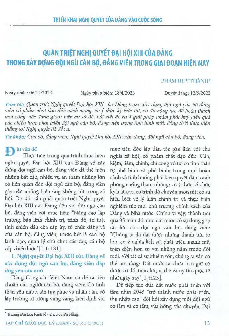 Quán triệt nghị quyết Đại hội XIII của Đảng trong xây dựng đội ngũ cán bộ, đảng viên trong giai đoạn hiện nay = Thoroughly grasping the 13th National Party Congress Resolution in developing a contingent of cadres and party members in the current period