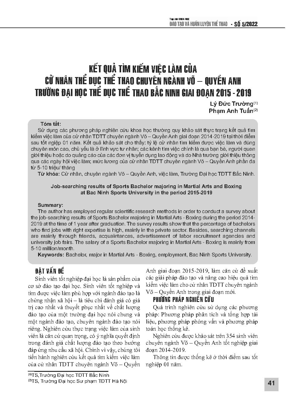 Kết quả tìm kiếm việc làm của cử nhân thể dục thể thao chuyên ngành Võ – Quyền Anh Trường Đại học Thể dục thể thao Bắc Ninh giai đoạn 2015-2019 = Job-searching results of Sports Bachelor majoring in Martial Arts and Boxing at Bac Ninh Sports University in