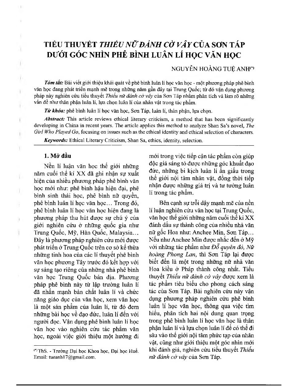Tiểu thuyết Thiếu nữ đánh cờ vây của Sơn Táp dưới góc nhìn phê bình luân lí học văn học = Shan Sa’s The Girl Who Played Go from perspectives of ethical literary criticism