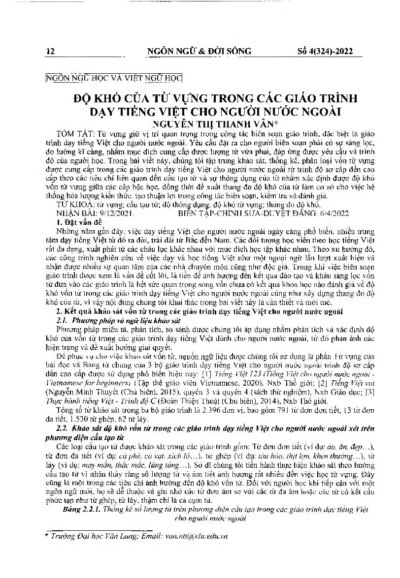 Độ khó của từ vựng trong các giáo trình dạy tiếng Việt cho người nước ngoài = Difficulty level of vocabulary in Vietnamese teaching textbooks for foreigners