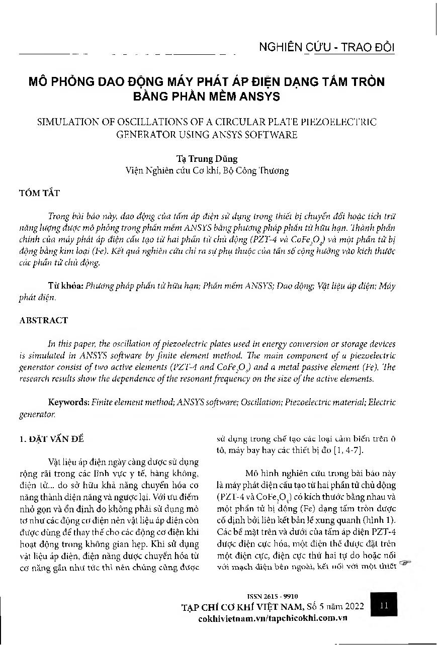 Mô phỏng dao động máy phát áp điện dạng tấm tròn bằng phần mềm ANSYS = Simulation of oscillations of a circular plate piezoelectric generator using ansys software