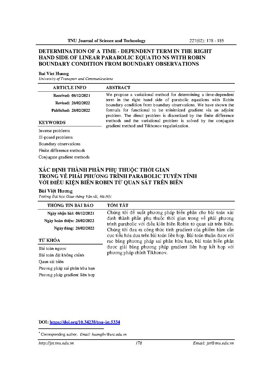 Xác định thành phần phụ thuộc thời gian trong vế phải phương trình parabolic tuyến tính với điều kiện biên robin từ quan sát trên biên = Determination of a time - dependent term in the right hand side of linear parabolic equatio NSs with robin boundary co