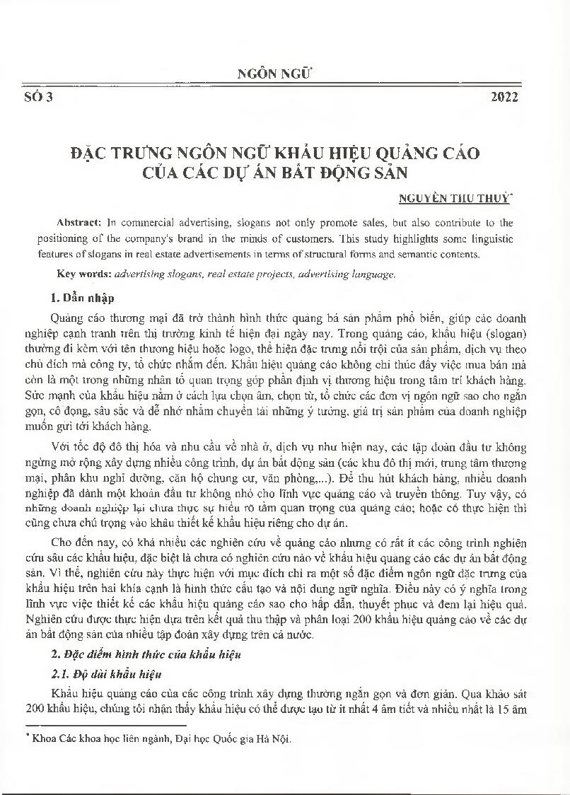 Đặc trưng ngôn ngữ khẩu hiệu quảng cáo của các dự án bất động sản = Linguistic features of Vietnamese real estate advertisements