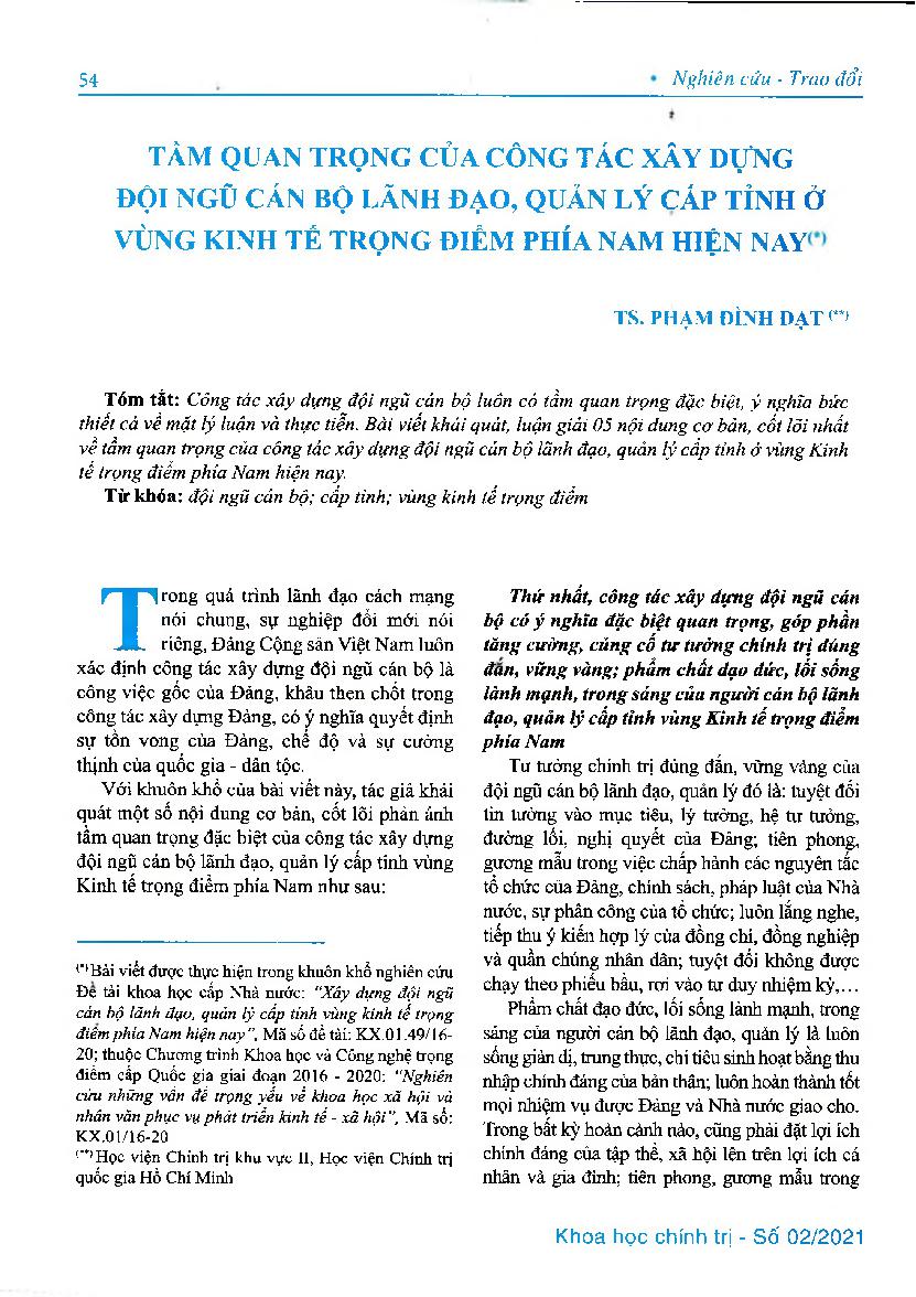 Tầm quan trọng của công tác xây dựng đội ngũ cán bộ lãnh đạo, quản lý cấp tỉnh ở vùng kinh tế trọng điểm phía nam hiện nay