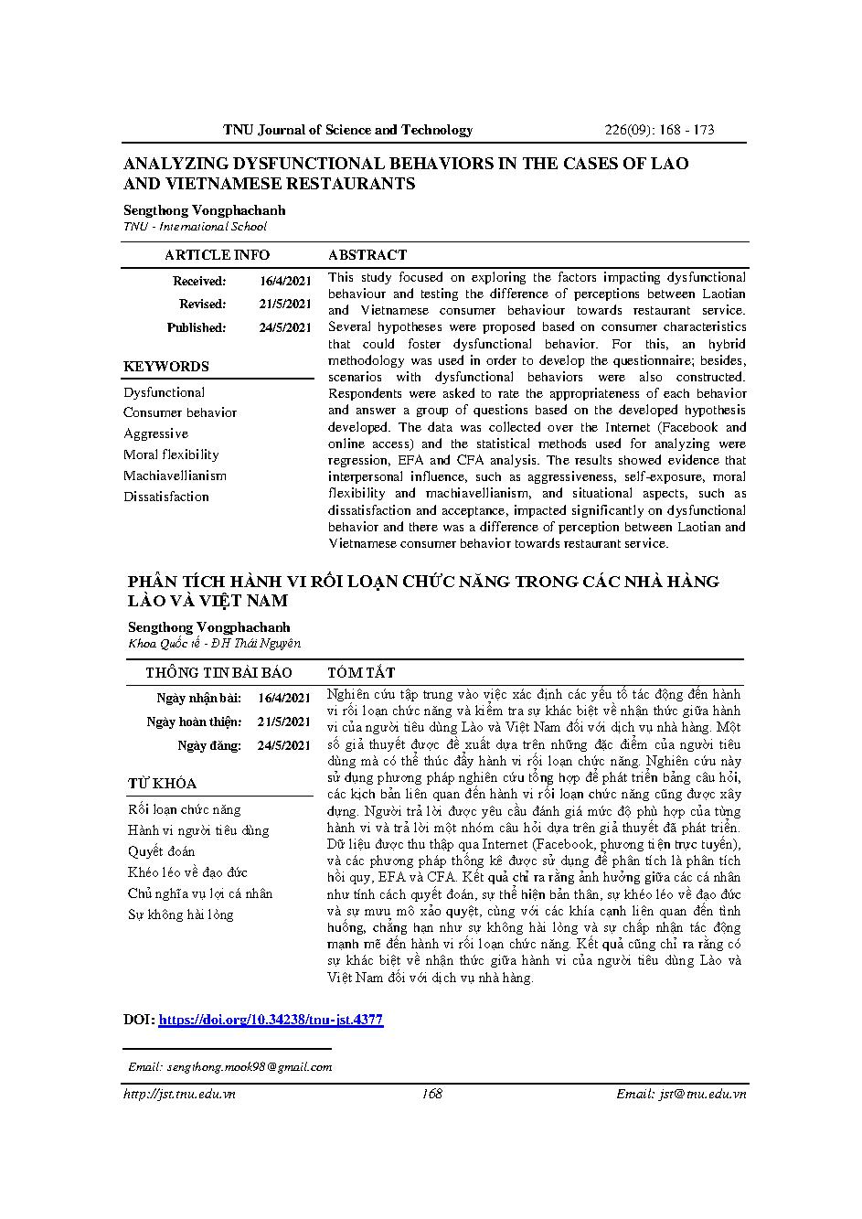 Phân tích hành vi rối loạn chức năng trong các nhà hàng Lào và Việt Nam = Analyzing dysfunctional behaviors in the cases of lao and vietnamese restaurants
