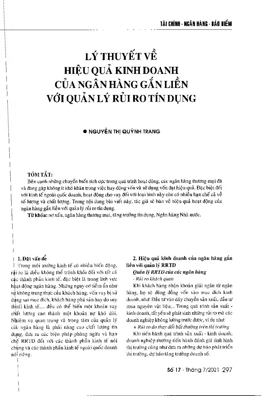 Lý thuyết về hiệu quả kinh doanh của ngân hàng gắn liền với quàn lý rủi ro tín dụng = The relationship between performance and credit risk management of banks