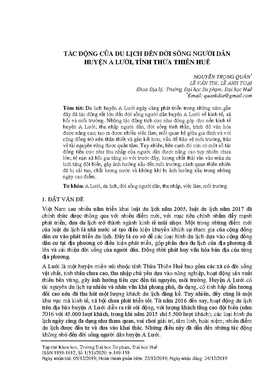 Tác động của du lịch đến đời sống người dân huyện A Lưới, tỉnh Thừa Thiên Huế = The impact of tourism on residents’ life in A Luoi district, Thua Thien Hue province