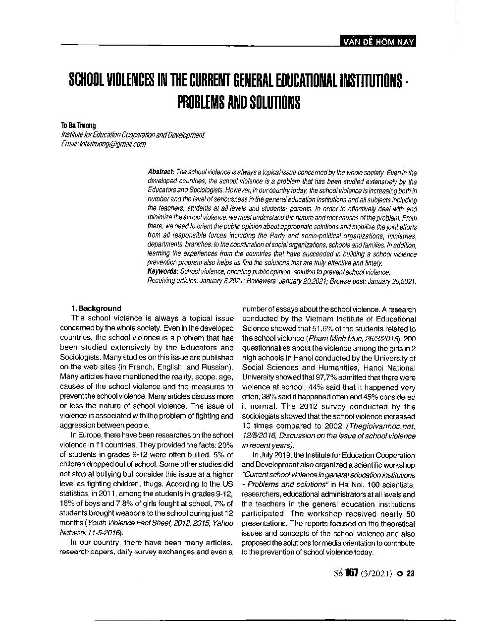 Bạo lực học đường trong các cơ sở giáo dục phổ thông hiện nay - vấn đề và giải pháp = School violences in the curent general educational institutions - Problems and solutions