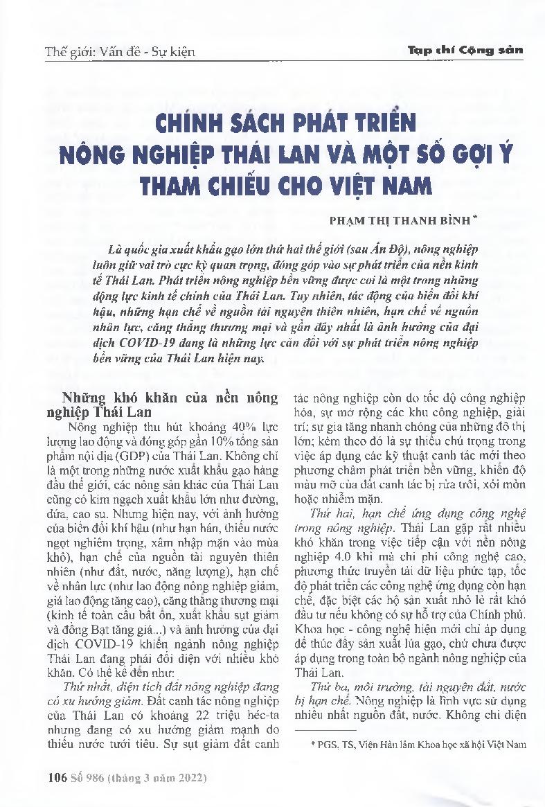 Chính sách phát triển nông nghiệp Thái Lan và một số gợi ý tham chiếu cho Việt Nam = Agricultural development policy in Thailand and some reference suggestions for Vietnam