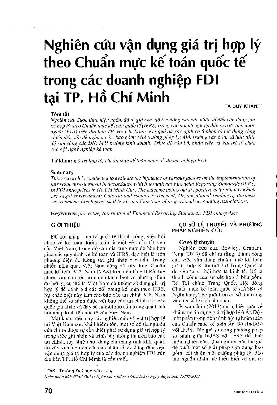 Nghiên cứu vận dụng giá trị hợp lý theo chuẩn mực kế toán quốc tế trong các doanh nghiệp FDI tại Tp. Hồ Chí Minh = Implementation of fair value measurement in accordance with International Financial Reporting Standards in FDI enterprises in Ho Chi Minh City