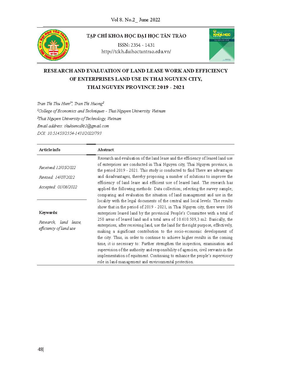 Nghiên cứu, đánh giá công tác cho thuê đất và hiệu quả sử dụng đất thuê của các doanh nghiệp trên địa bàn thành phố Thái Nguyên, tỉnh Thái Nguyên 2019 - 2021 = Research and evaluation of land lease work and efficiency of enterprises land use in Thai Nguye