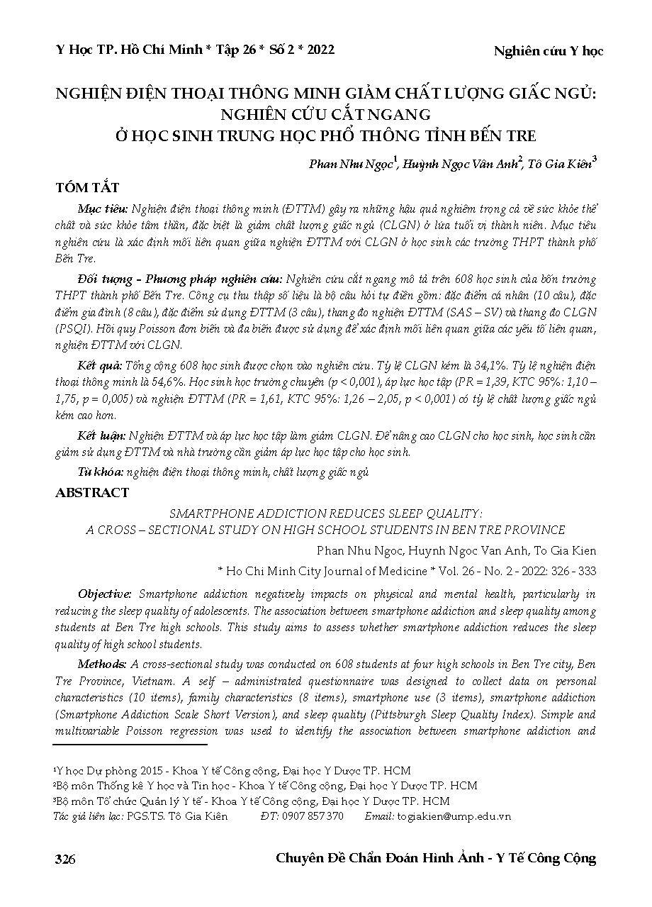 Nghiện điện thoại thông minh giảm chất lượng giấc ngủ: Nghiên cứu cắt ngang ở học sinh trung học phổ thông tỉnh Bến Tre
