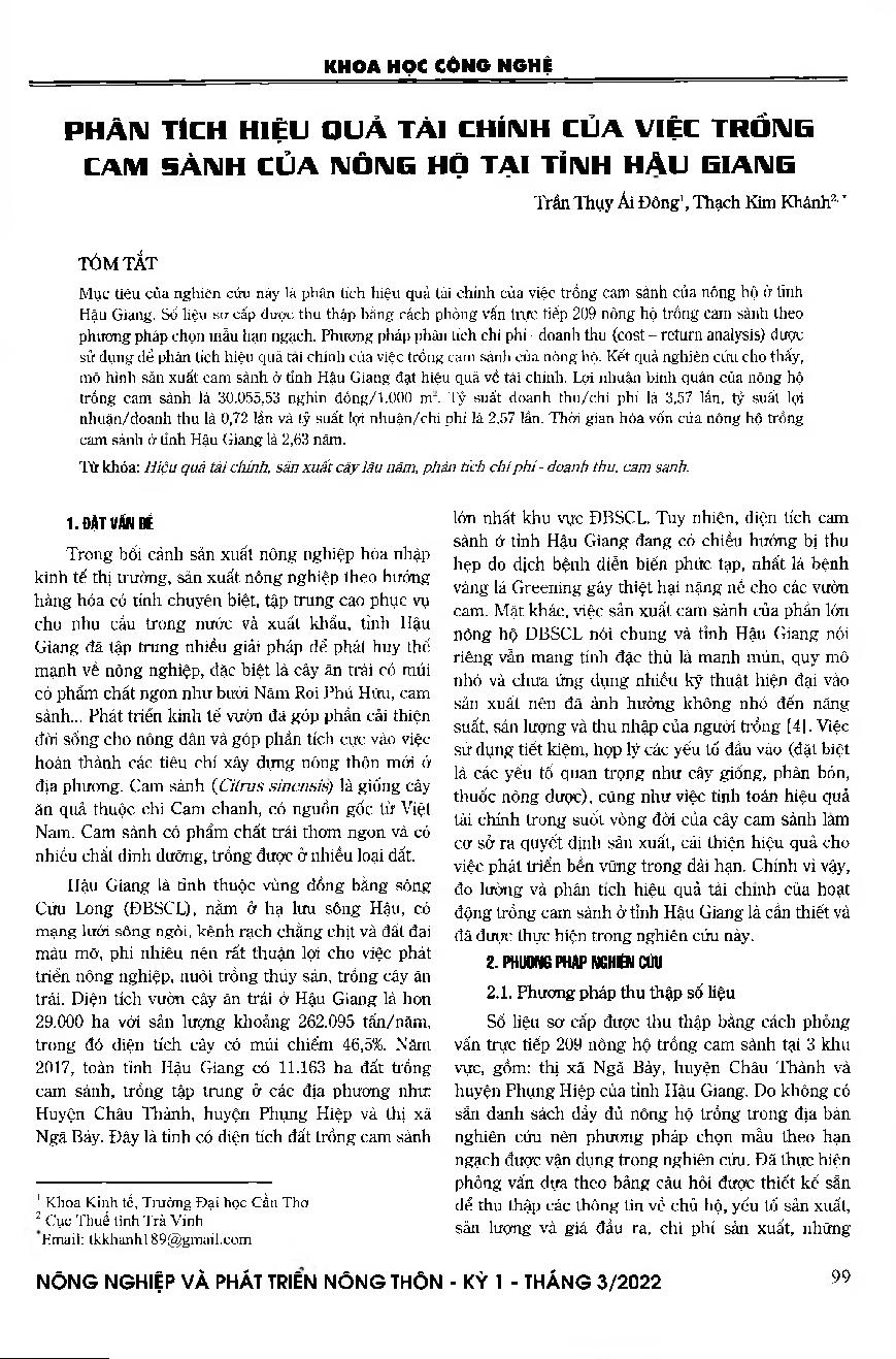 Phân tích hiệu quả tài chính của việc trồng cam sành của nông hộ tại tỉnh Hậu Giang = Financial efficiency analysis of perennial production: case of king mandarin at Hau Giang province