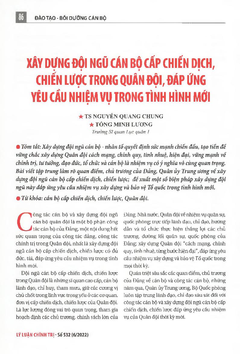 Xây dưng đội ngũ cán bộ cấp chiến dịch, chiến lược trong quân đội, đáp ứng yêu cầu nhiệm vụ trong tình hình mới = Building the Army’s contingent of cadres at campaign and strategic levels on par with requirements ofthe new context