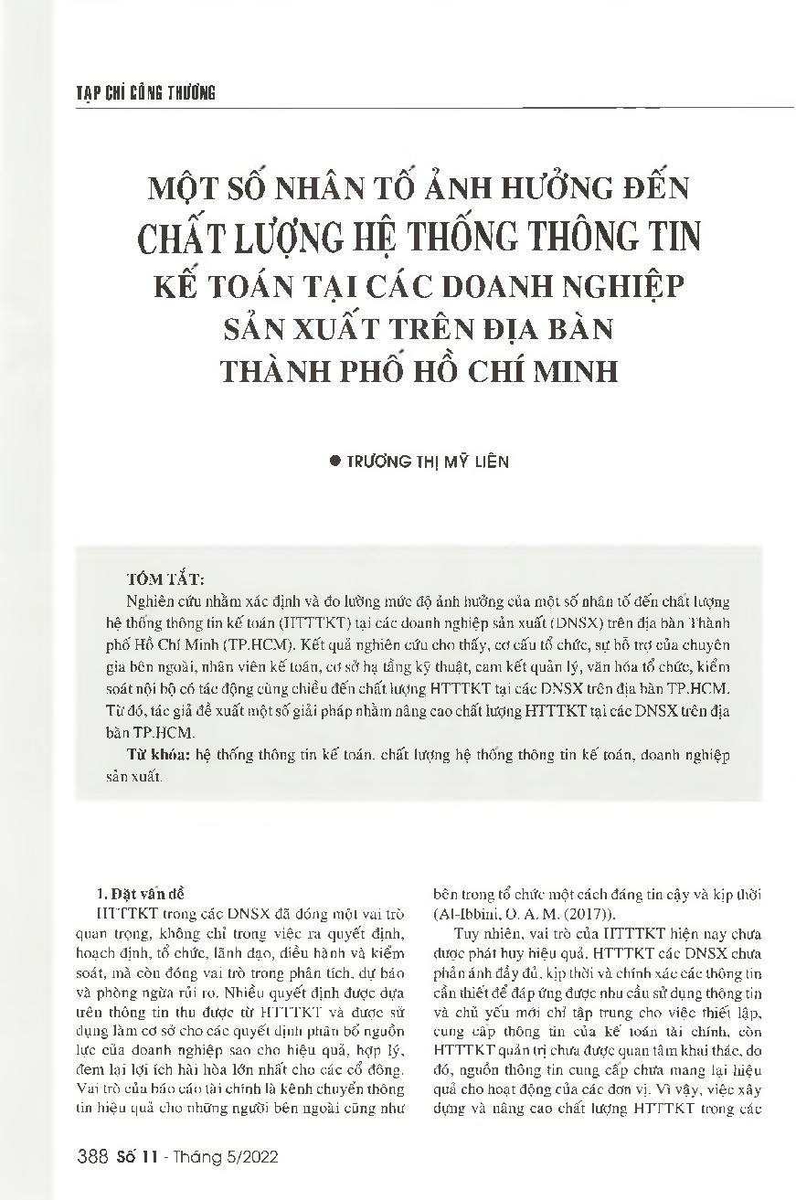 Một số nhân tố ảnh hưởng đến chất lượng hệ thống thông tin kế toán tại các doanh nghiệp sản xuất trên địa bàn thành phố Hồ Chí Minh = Factors affecting the quality of accounting information systems at manufacturing enterprises in Ho Chi Minh City