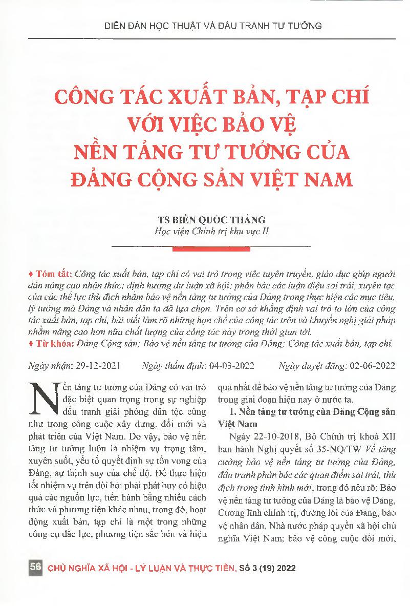 Công tác xuất bản, tạp chí với việc bảo vệ nền tảng tư tưởng của Đảng Cộng sản Việt Nam = Publication and journal practices in protecting the ideological foundation of the communist Party of Viet Nam