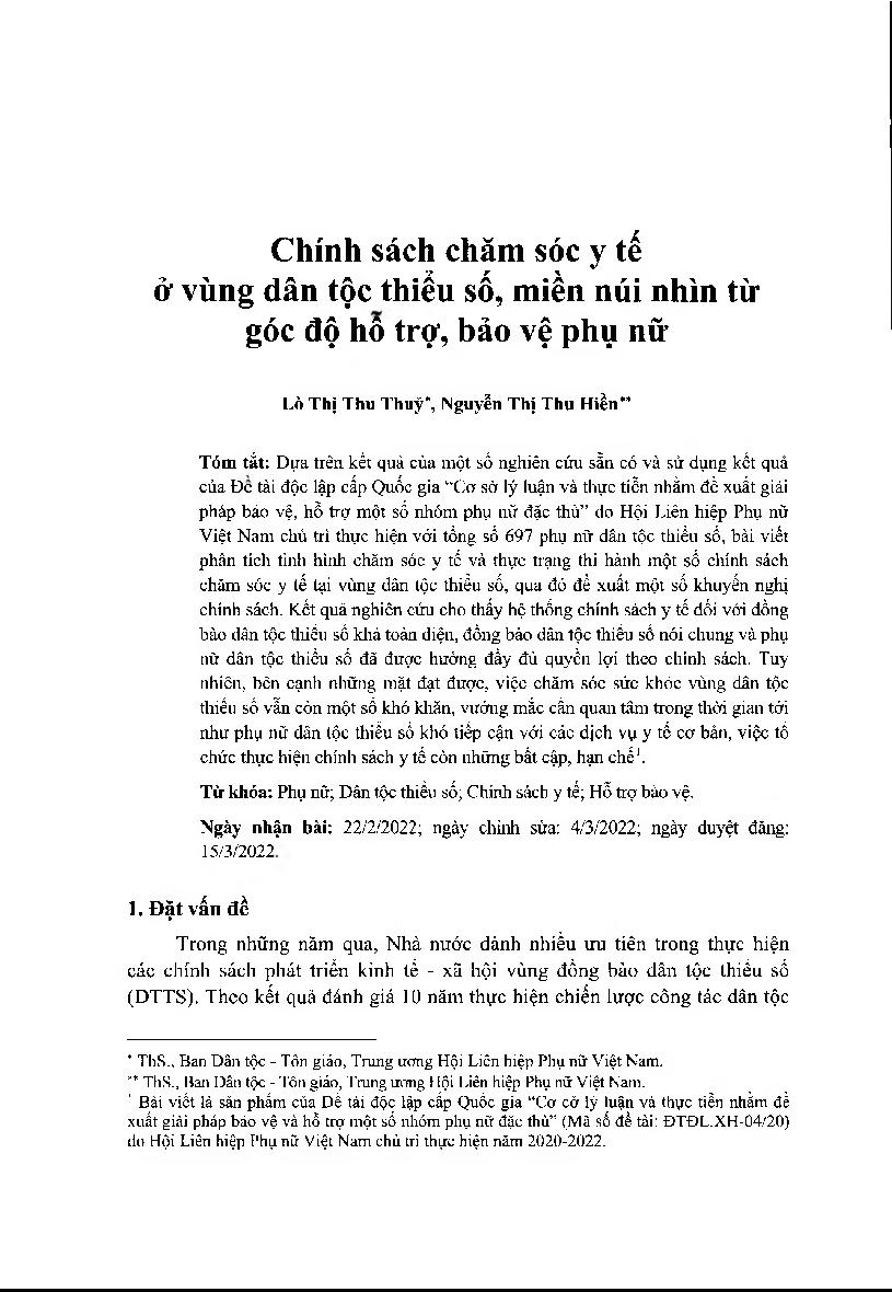 Chính sách chăm sóc y tế ở vùng dân tộc thiểu số, miền núi nhìn từ góc độ hỗ trợ, bảo vệ phụ nữ = Health care policies in ethnic minority and mountainous areas from the perspective of women&; 39;s support and protection