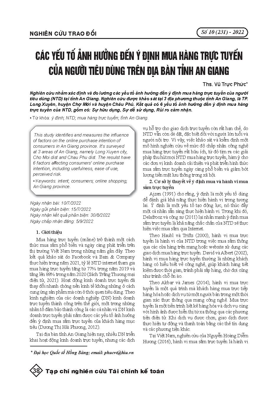 Các yếu tố ảnh hưởng đến ý định mua hàng trực tuyến của người tiêu dùng trên địa bàn tỉnh An Giang = Factors affecting the online shopping intention of consumers in An Giang