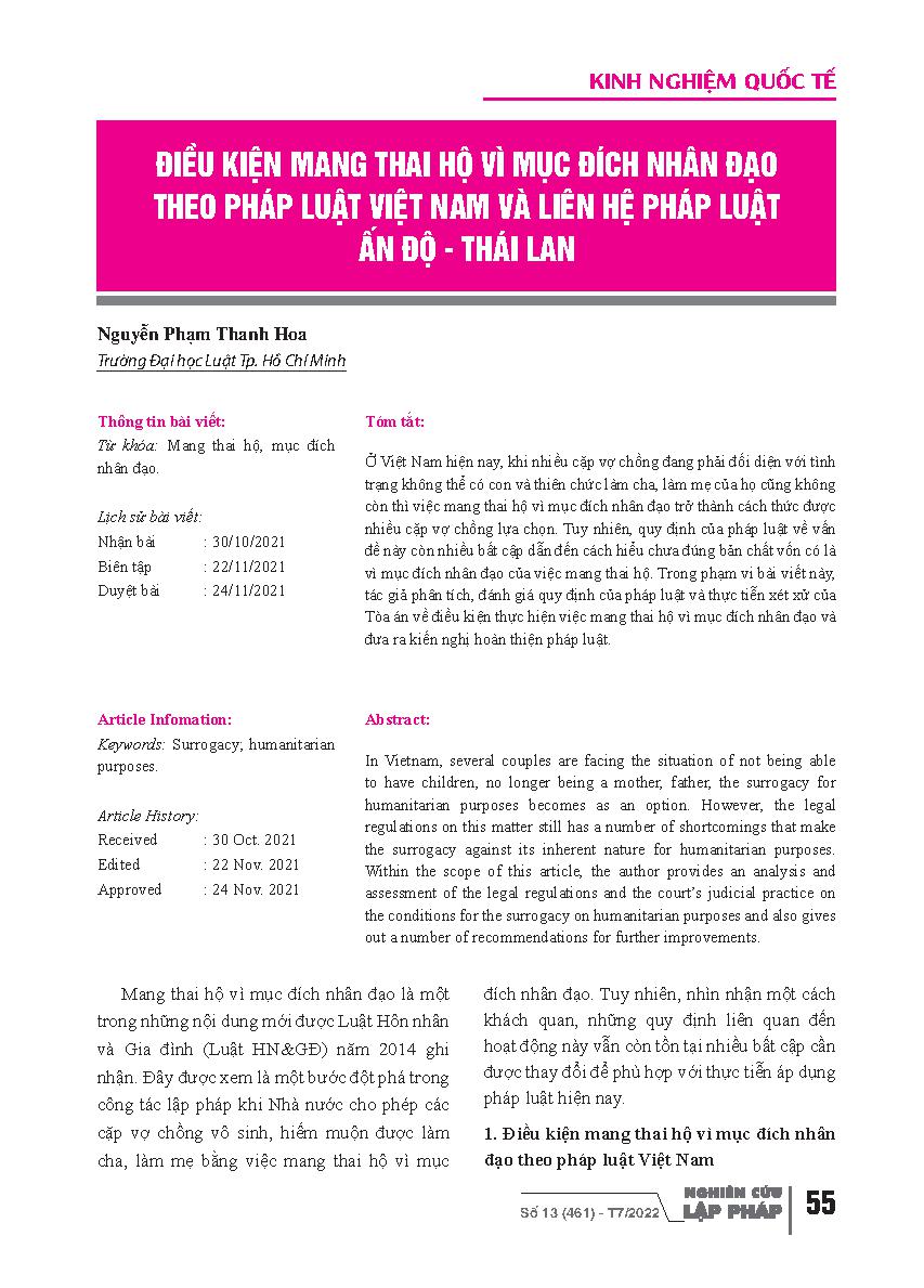 Điều kiện mang thai hộ vì mục đích nhân đạo theo pháp luật Việt Nam và liên hệ pháp luật Ấn Độ - Thái Lan = Conditions for Surrogacy on Humanitarian Purposes under Legal Regulations of Vietnam and related Laws of India and Thailand