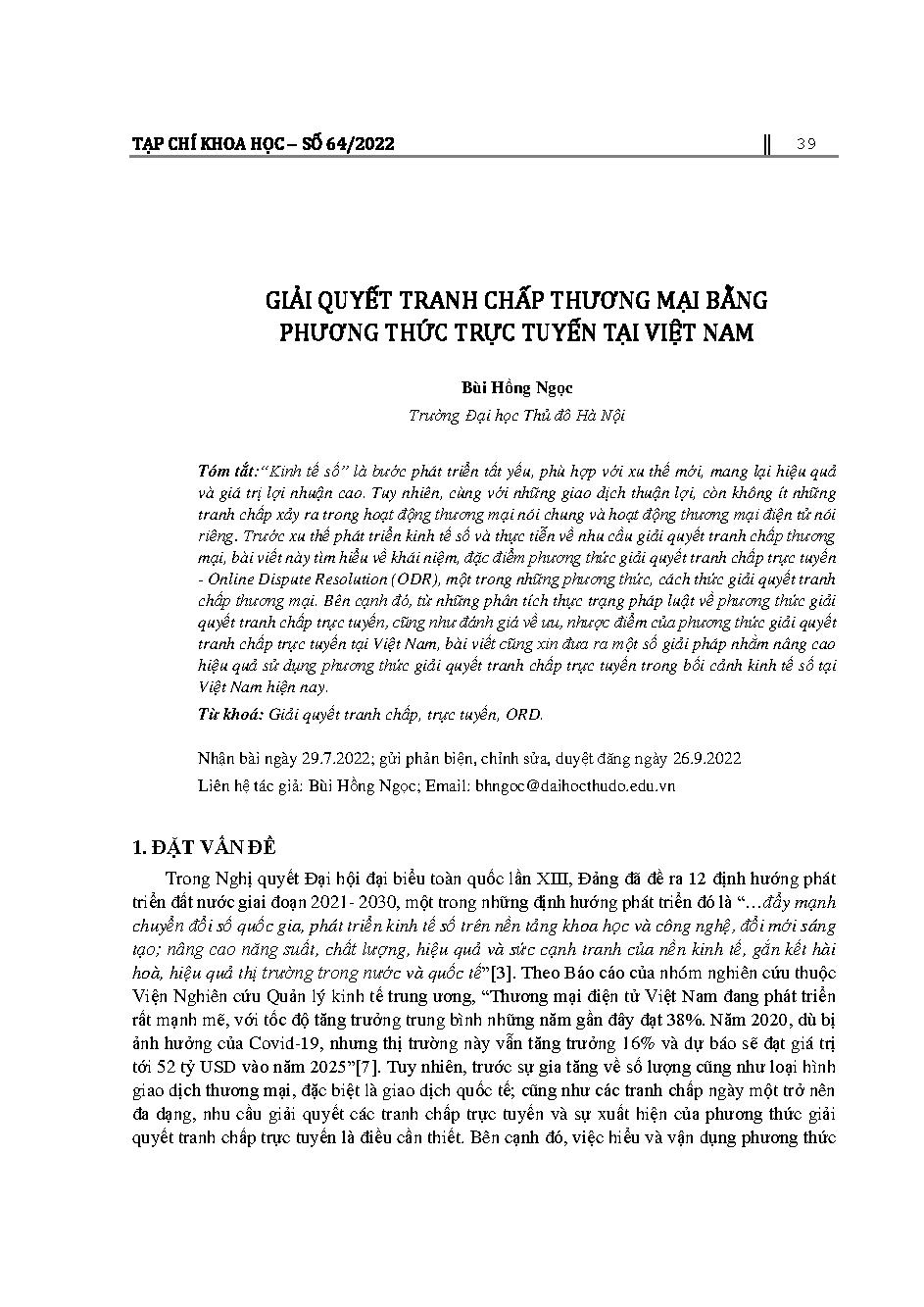 Giải quyết tranh chấp thương mại bằng phương thức trực tuyến tại Việt Nam = Using online method to dispute commerccial resolution in Vietnam